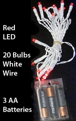 Red LED mini light strand with 20 bulbs and battery pack. 20 Red LED bulbs on White Wire. 4 Inch LED spacing, strand is 8 foot long overall. Bright 5MM type LED's on high performance white wire. Use for center pieces, topiary, floral arrangements, wedding decorations, cakes and bridal bouquets. Battery operated LED mini lights run on 3 AA batteries. 4 Inch LED Bulb Spacing 20 Red LED Bulbs 105 Inch Overall White Cord On/Off switch is located on battery pack. Batteries not included.